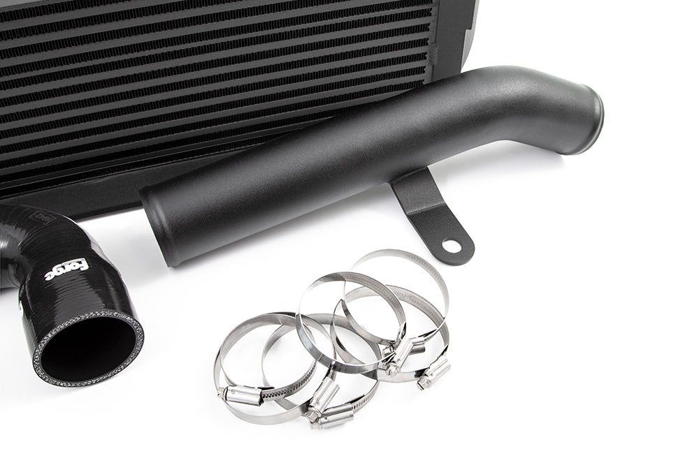 The inlet and outlet sizes have been increased in diameter to 65mm, giving an increase of 27% more volume over the stock cooler to give perfect flow. The development team also added a custom hard pipe increasing the diameter by 14 mm to 64mm up from the factory 50mm. This replaces the stock factory pipe on the hot side to ensure this package gives you all you need for maximum performance gains on high levels of tune.The boost pipe and intercooler come in our standard black textured finish powder coat for maximum longevity.